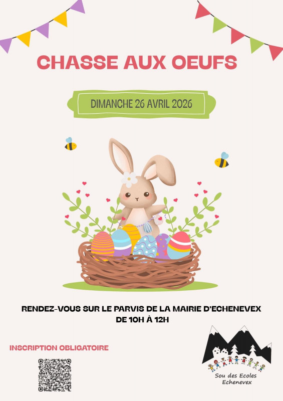 Le Sou des Écoles d'Échenevex organise la première chasse aux œufs du village, le dimanche 26 avril de 10h à 12h, sur le parvis de la Mairie d'Échenevex.